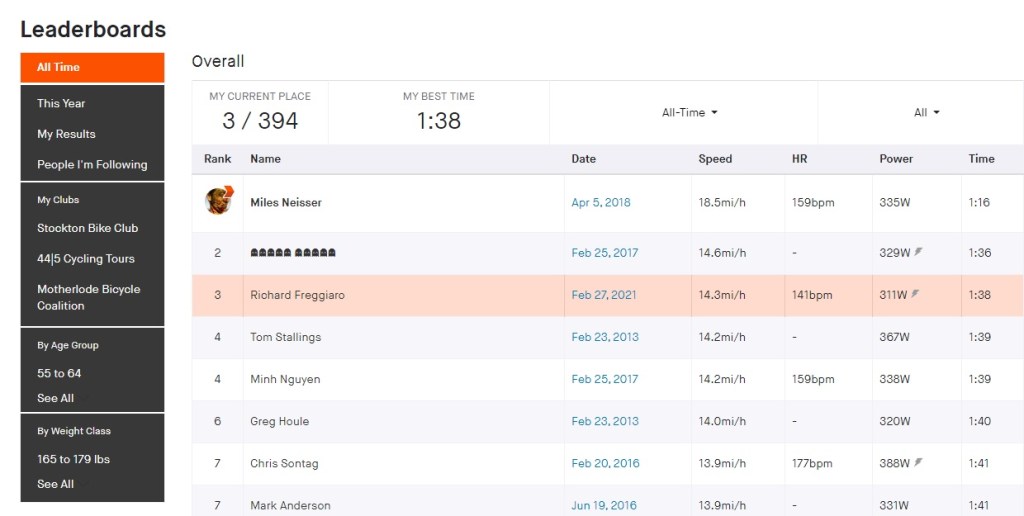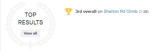 So I hit the hill hard and between my 311 watts and the big tailwind, I managed to get 3rd overall. If ever a record needed as asterisk that one certainly did. Drafting behind a car or motorbike or e-bike to set a PR seems like cheating, but the tailwind is just part of the course so I don’t feel guilty. Well perhaps a little.
