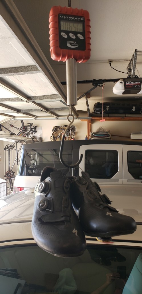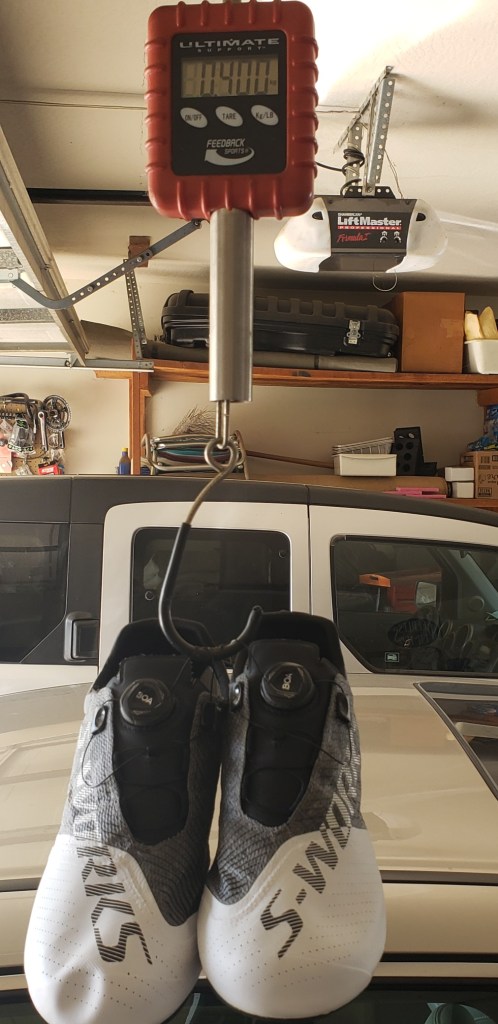The Exos shoes weigh all of 400 grams with cleats, while the S Works shoes tip the scale at 650 grams. That is a savings of 0.55/lb., or 8.8 ounces. And it is ‘rotating weight’. Because of something called ‘moment of inertia’ or ‘angular momentum’ or some other concept of physics I don’t understand, this is supposed to be equivalent to reducing the static weight of the frame by about twice that much, some 500 grams.