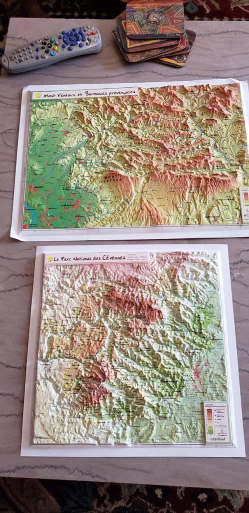 We are not going to France until late July at the earliest. So just to make sure that I remember what I am missing, my friend and tour guide Gerry sent me a couple of wonderful relief maps of the area we have cycled since 2014.