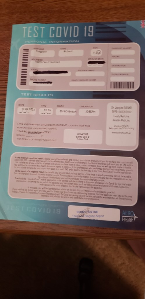 A CDC Vaccine Card got me into France, but it wouldn’t get me home. Reentering the U.S. required a negative Covid test within 72 hours of boarding the flight. 44|5 came through again. Gerry made appointments for us at the Toulouse airport the day before our flights home. He escorted us to the testing station and handled the check in. 15 minutes later, four Americans had their negative tests in hand. And fewer euros in those same hands; we had to pay 42.50 euro each (about $51) for the test.