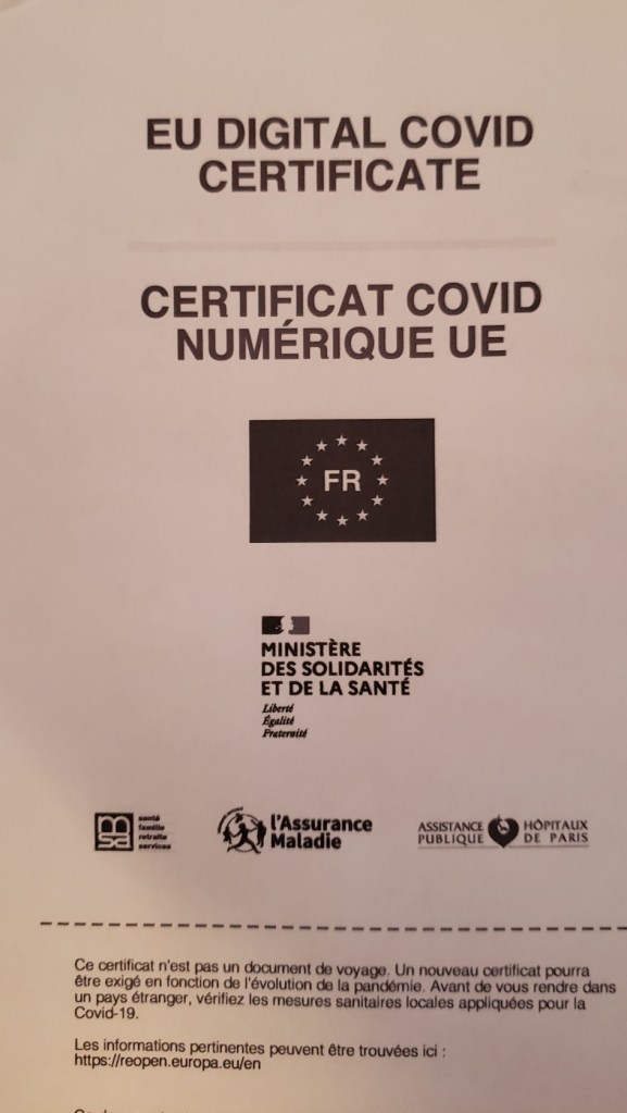 My favorite touring company, 44|5, came to the rescue! Before the trip John and Gerry had us all send copies of our CDC Cards and passports to them. John found a French pharmacy that would enter the information into the French system. So we had our French passes on paper when we started the tour, a day before the new French requirements went into effect. Gerry advised us to download an app that would allow us to scan our paper versions into our cell phones and create a digital wallet which would allow us to show our pass when requested.