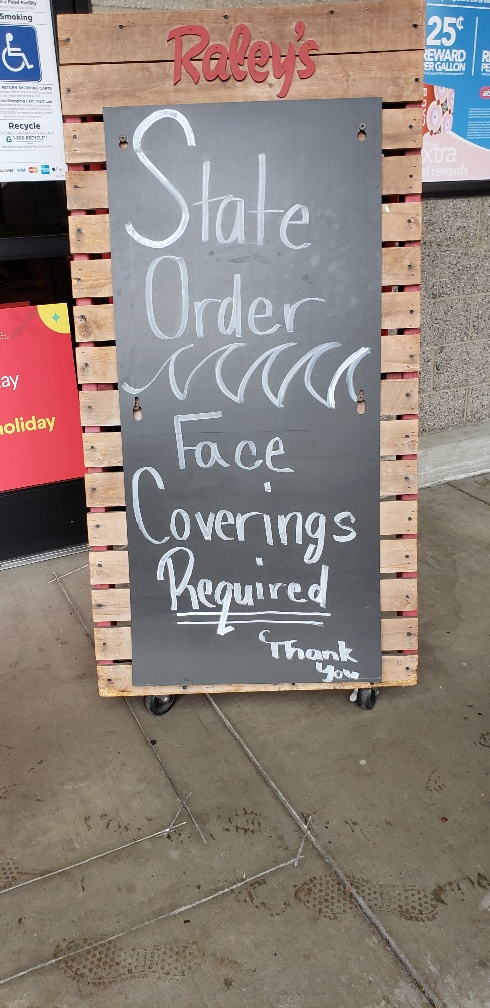 On my first visit to Raley’s since Newsom’s new mask mandate, the store policy was clear. Not just a small sign posted on the door either; someone with very good chalk calligraphy skills had been at work.