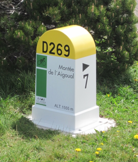 The bornes are placed at 1 kilometer intervals, so when I’m cycling on flat terrain I see one every 2 minutes or so. But it is when I am climbing one of the many cols that the bornes really get interesting.