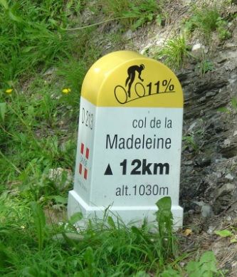 On a climb up a col or a mont or an Alpe the bornes provide a wide variety of information, depending on how much the local Department of Transportation supervisor likes cycling. The borne might tell you how far it is to the summit, what the current elevation is, what the elevation of your goal at the top is, and the average gradient of the next 1000 meters of pavement. This last figure can be a mite depressing if you are getting kind of tired after an hour of climbing and are informed that for the next kilometer you will be confronting a 10% slope.