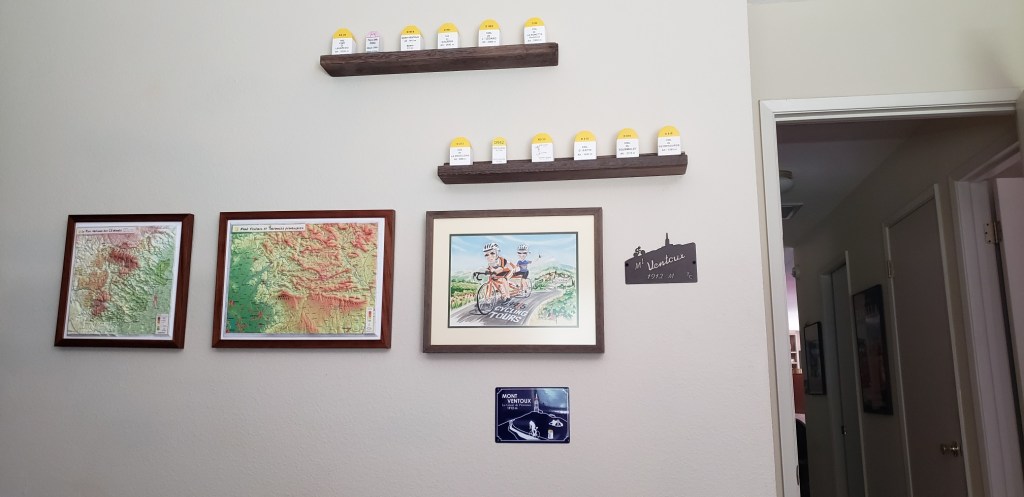 You can purchase miniature replicas of the bornes to take home with you, and on my most recent trip I decided to buy as many as I could find from climbs I’ve done. Along with my relief maps of the Cevennes and Mont Ventoux, and the delightful caricature 44 | 5 commissioned as a gift for Stoker and me, the bornes are displayed on the French Wall in my study.