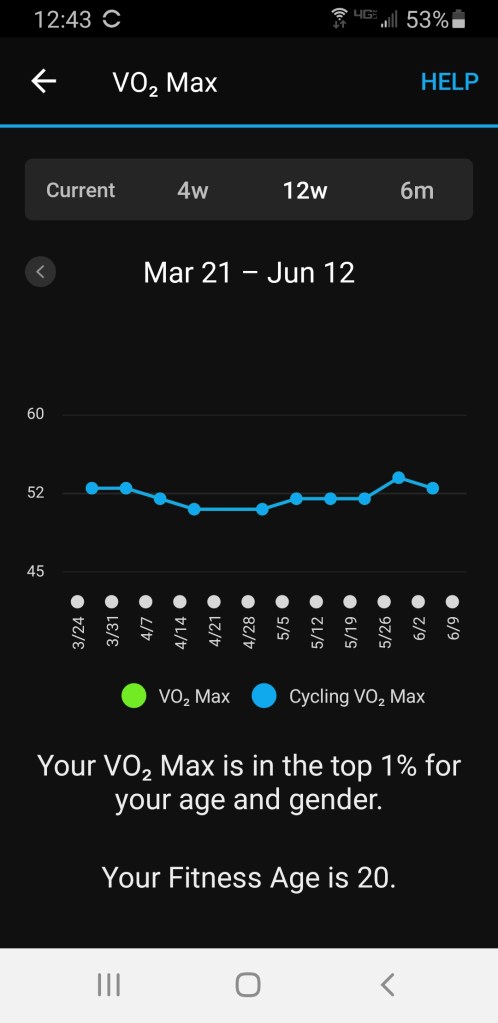 Now despite my almost constantly saying what a weak rider I am, the truth is that I am a pretty fit cyclist. Notice that I do not say I am a great bike handler or descender or that I have perfect pace line riding skills or that I can knock out double centuries by the dozen. But I am more than reasonably fit, at least for cardio fitness. Look at what Garmin thinks: