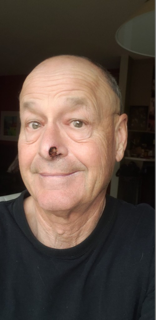 Last month I had another annual appointment and I expected another negative result. But he saw something on the tip of my nose. I knew there was a very tiny red spot there which had appeared recently, but I couldn’t imagine it was a big deal. He thought otherwise. He took tissue for a biopsy. The numbing needle stung a bit but otherwise it was painless. He put in some stitches and told me I’d get results in a week or less.