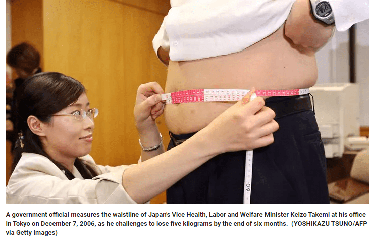 The law mandates that all employees aged between 45 and 74 have their waistlines measured by their employer annually and receive guidance if they do not lose weight after three months, but, despite rumors, Japanese citizens themselves cannot be fined or imprisoned for being overweight.