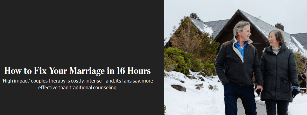 Ellyn Bader, a psychologist in Menlo Park, Calif., has helped develop the high-impact approach, the centerpiece of which is the “couples intensive”—16 hours of highly structured work over a two-day period. Why am I not exactly shocked that this is a Coastal Cali Construct? I can’t imagine Dr. Bader setting up shop in Linden.