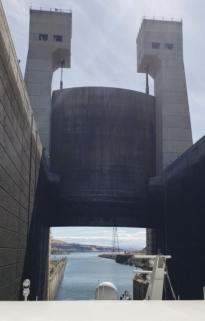 Diane and I have just returned from a cruise from Lewiston to Astoria on the Snake and Colombia rivers. The highlight for me was the series of locks and dams.These 8 dams turn the lower part of the Snake and Colombia Rivers into a series of lakes each about 100 feet below the next, and the river boat headed downstream has to pass through a lock to descend to the next level.