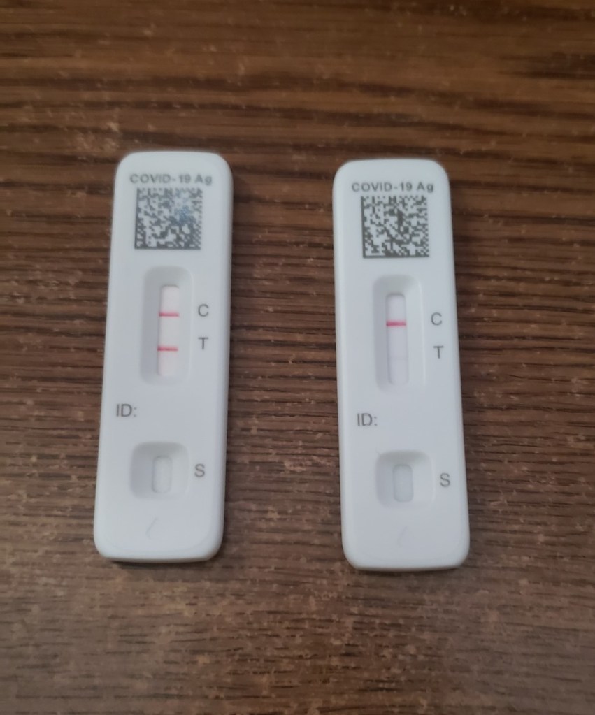 I started testing again on Monday, hoping for the negative result that would indicate that I was most likely no longer contagious and could return to public interactions without guilt or any significant danger to other people. Alas, Monday’s test was still positive. Ditto Tuesday, Wednesday and Thursday, although I continued to feel better. I was starting to despair and thinking I would have to look into getting groceries delivered, when I got a nice surprise: Thursday is on the left and Friday (today) on the right.
