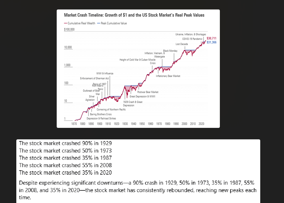 There is over 100 years of stock market history, with many examples of these crashes. Everything looks bad and everyone is sure that the end is near and the apocalypse is upon us. And eventually the market moved to new highs and resumed its long term trend of producing real returns (adjusted for inflation) of around 7.5% per annum. To get that return you have to accept volatility. You don’t have to like it, and if it causes you anxiety and loss of sleep, then better to stick with CD’s. You might beat inflation by 1 or 2%.
