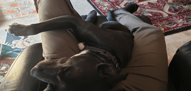 Lucia has a perfectly comfortable dog bed in the family room, but during my morning coffee or pre prandial cocktail she prefers to become my 42 lb. lap dog. I have a big stuffed chair, and she hops up into my lap and stretches her back legs out onto the stool. Getting up to get my second cup of coffee requires a bit of contortionism on my part. She ain’t giving up her spot voluntarily.